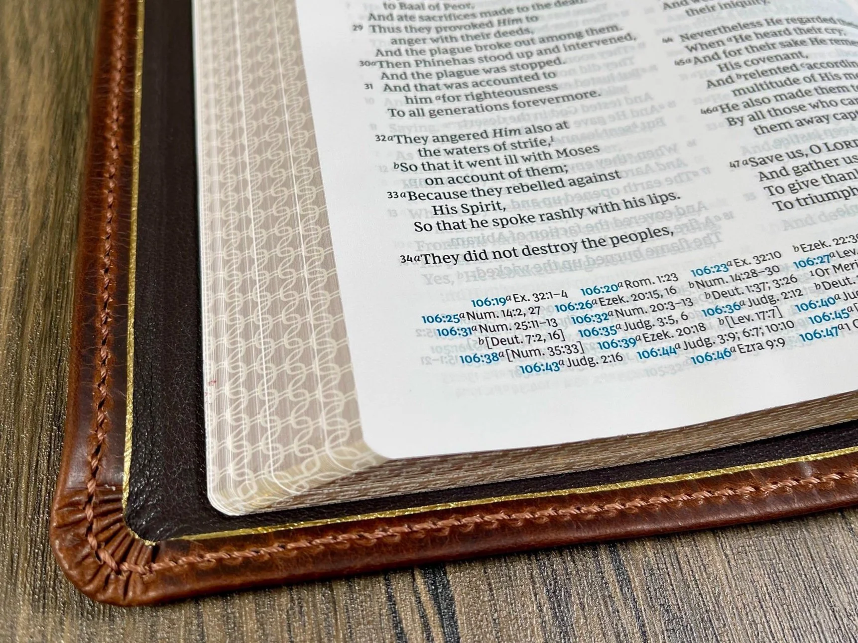 A Smyth-sewn Bible binding is created by stitching together signatures to create the full book block. Smyth-sewn binding is known for durability and a book block that easily lays flat.