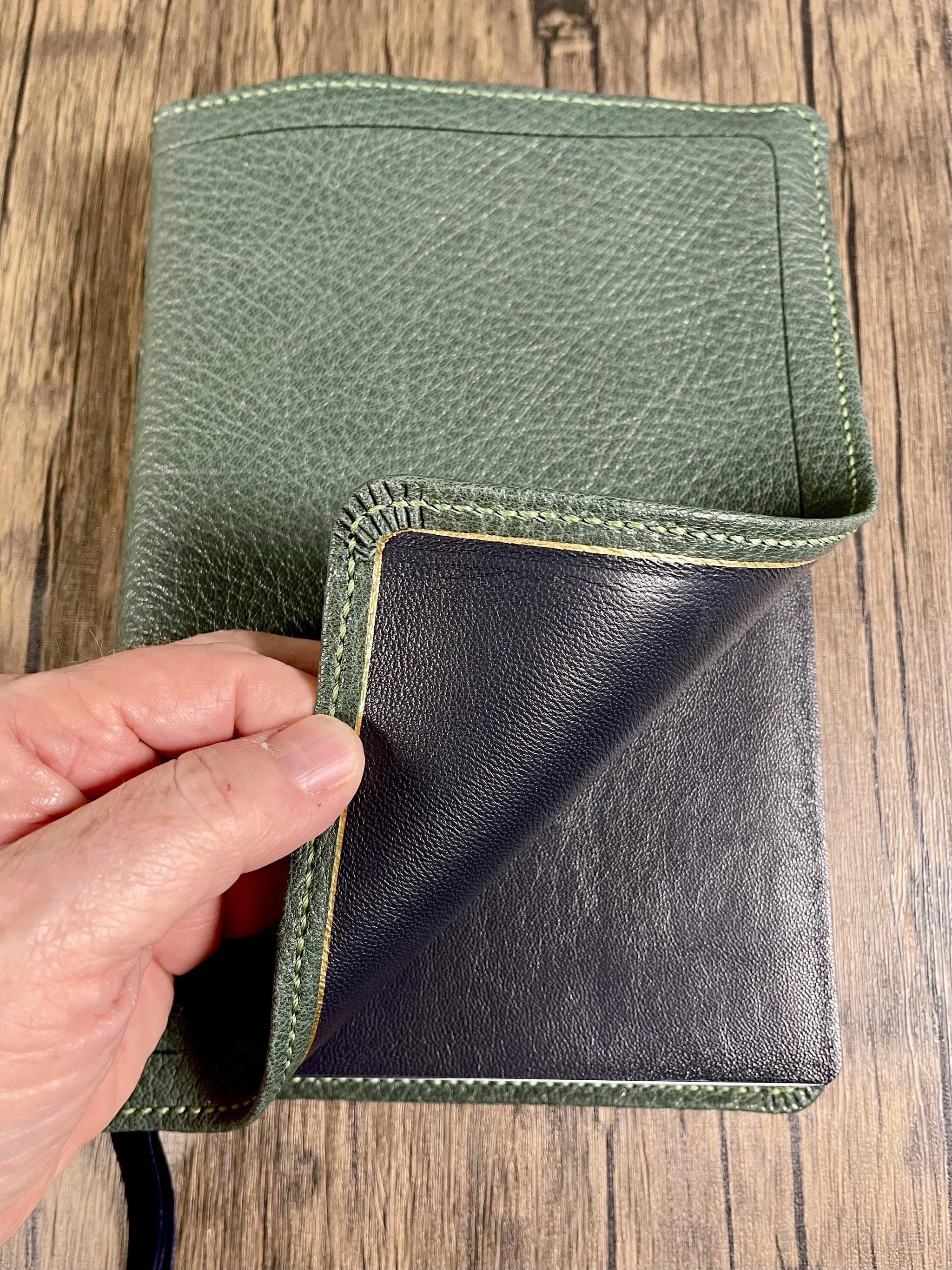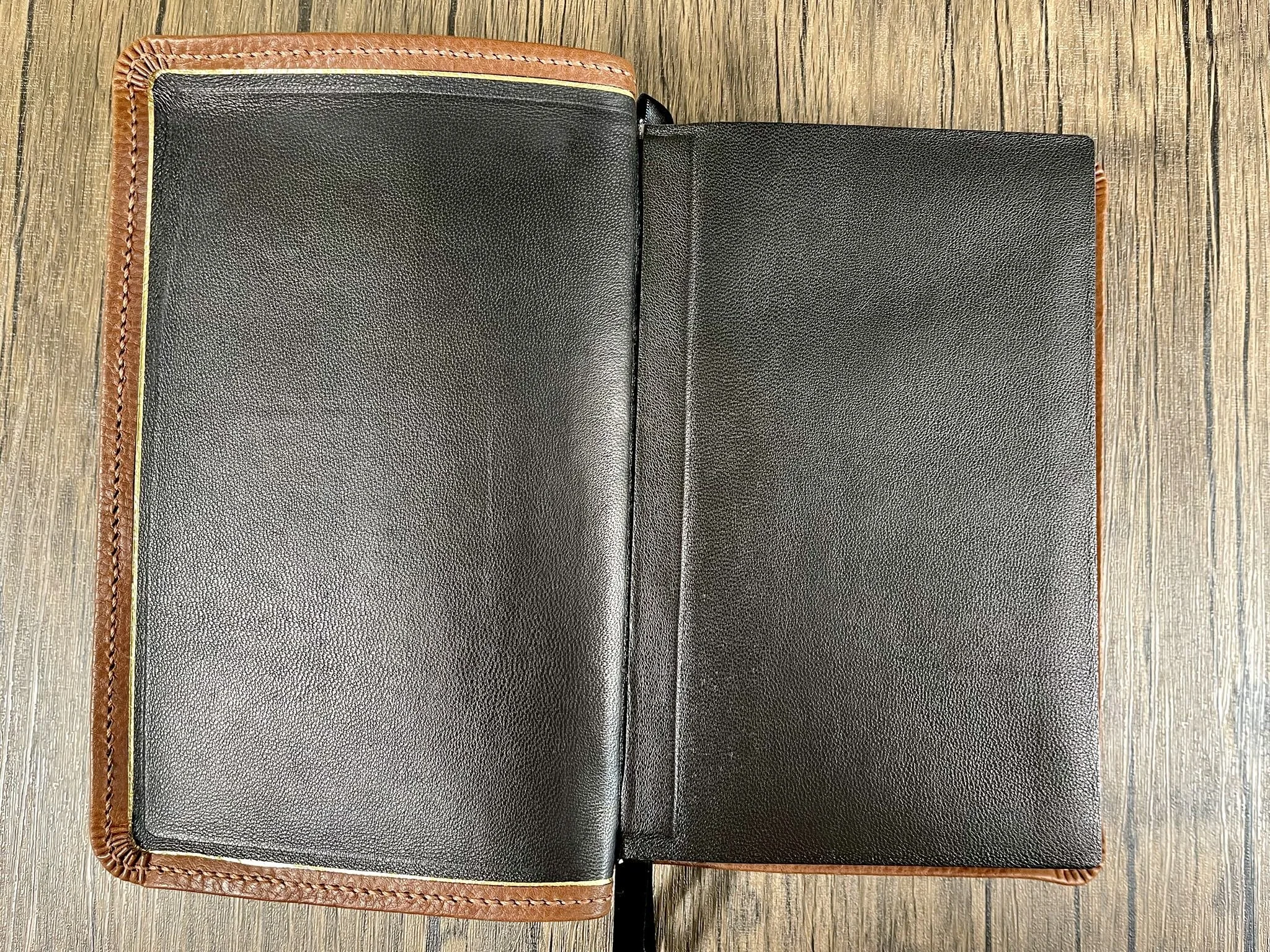 This refers to the method of bookbinding wherein a leather cover attaches to the interior paper pages (called a “book block”) via tabs of the cover’s leather liner going along the “edges” of the book block. This handcrafted process utilizes genuine leather for the liner material, rather than paper or vinyl. This results in a supple and flexible, yet especially durable cover. This old-world technique reinforces the hinge between the cover and book block, taking stress off of the paper interior. All of our rebinds are built using this method.