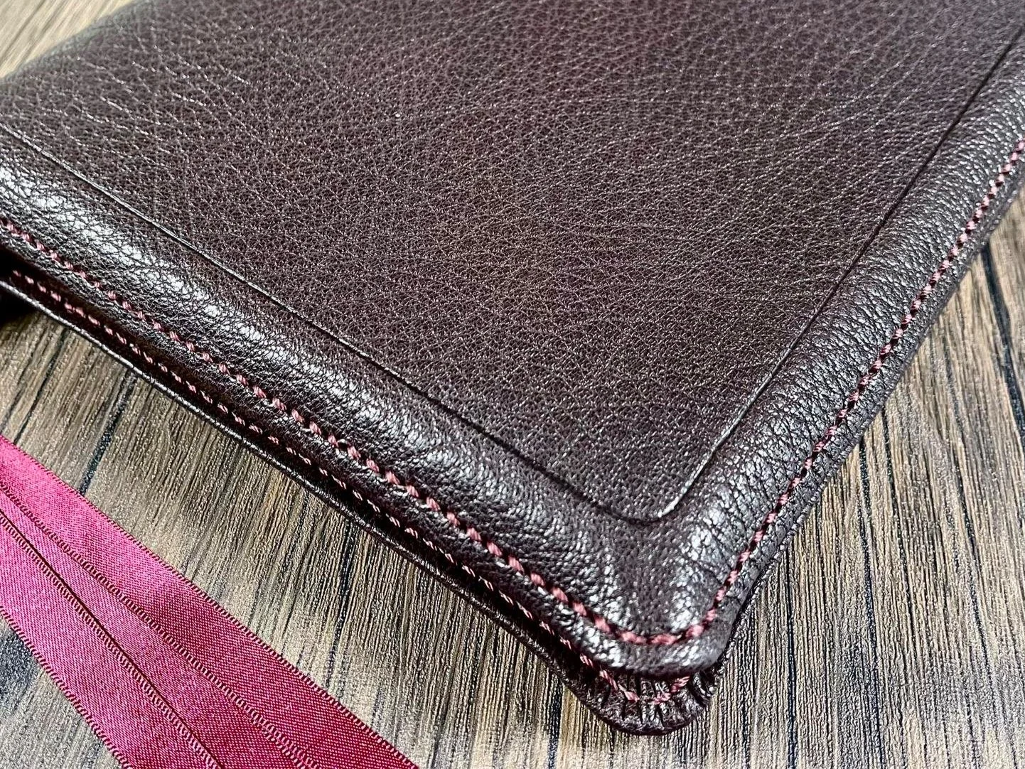 Perimeter Stitching refers to the thread stitching around the perimeter edge of the Bible cover. This premium feature adds durability to the edges of the cover, preventing the edges from peeling or coming undone, as well as a subtle beauty framing the Bible itself. As with many other features of our Bible rebinds, perimeter stitching is included in our standard rebinds.