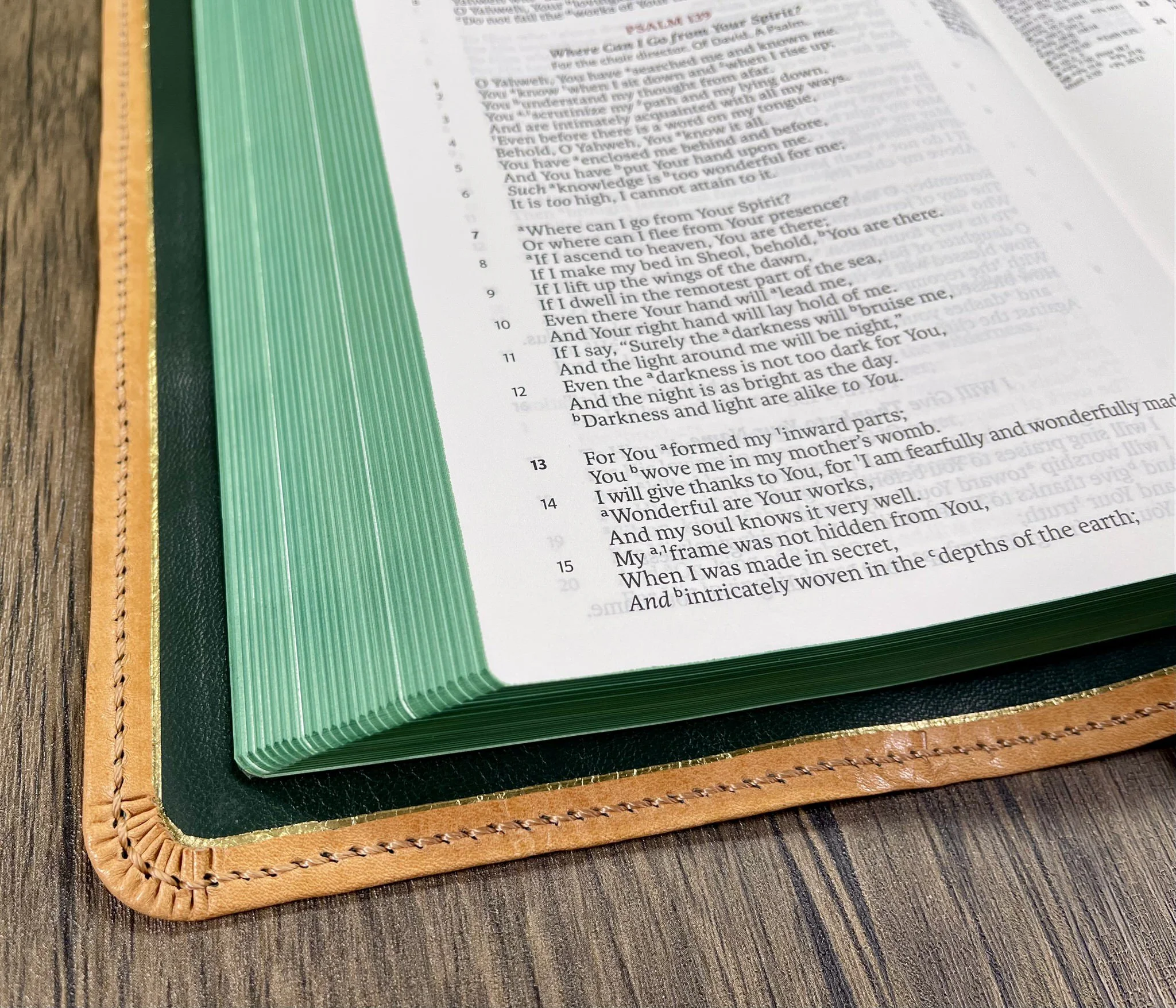 Semi-Yapp: Believed to have originated from a style of British bookbinding in the 1800s, “yapp” refers to the length of the leather used for a Bible cover, for the purpose of protecting the pages. Semi-yapp adds both an old-world beauty and practical function. the Bible’s yapp partially wraps around the edge of the text block, but does not touch from the front and back cover.
