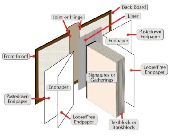 The paste-down binding method connects the cover and the book block with an adhesive through an endsheet that functions as the hinge. This endsheet covers a board, which provides support to the cover. This is the most common and economical practice for Bible binding used by Bible publishers. However, Resurrection Rebinding only uses Edge Lined construction with our rebinds.