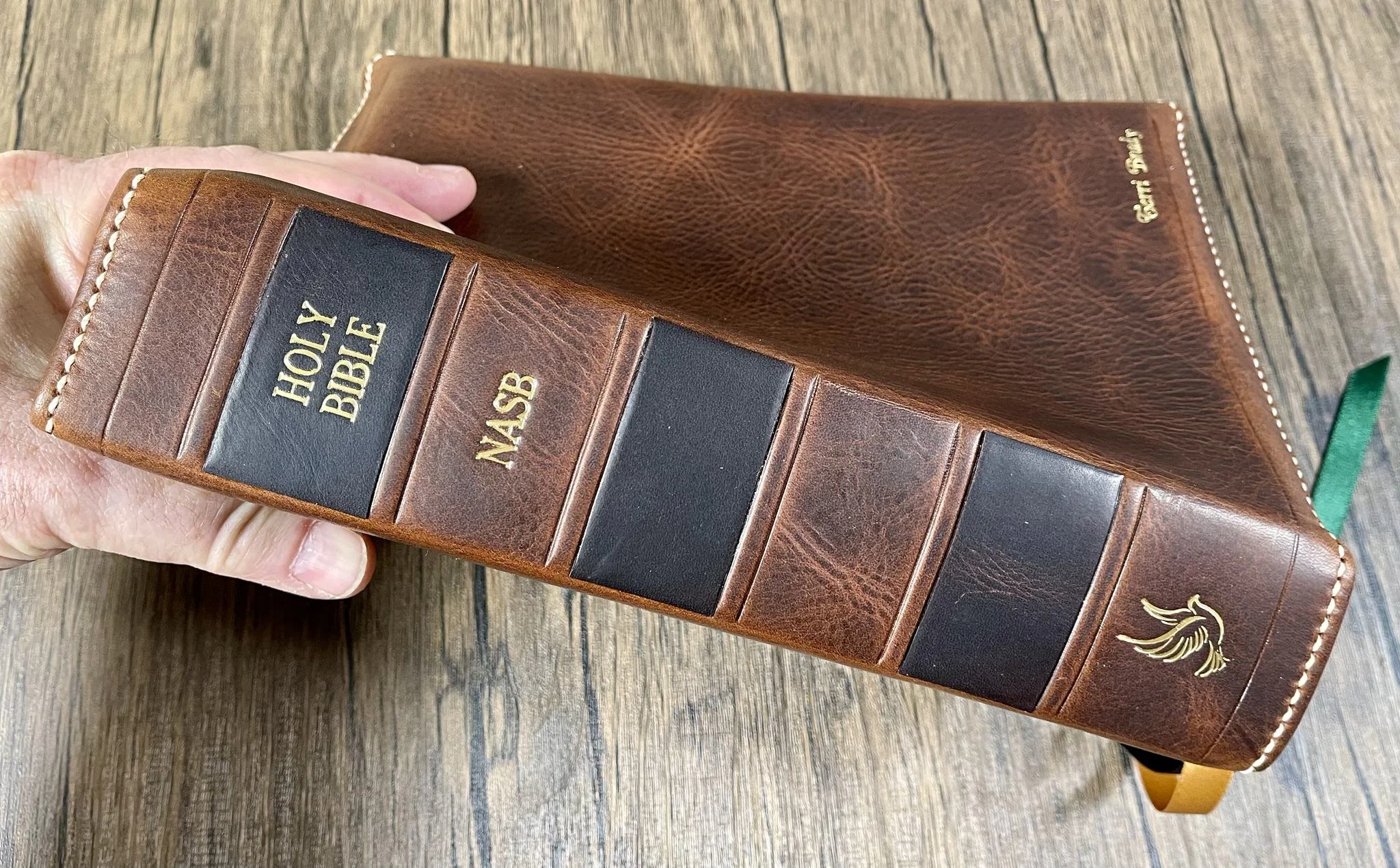 Bible spine stamping is a process of adding information. Our standard spine stamping includes, HOLY BIBLE, translation acronym (ie NIV, ESV, etc.), and maker’s mark (Dove). Additional information can be added for an additional cost. Spine stamping is done using heated dies to imprint text or images using metallic foils, or can be blind stamped (no foil).