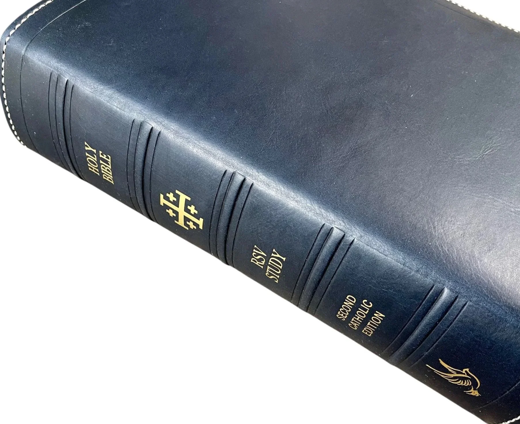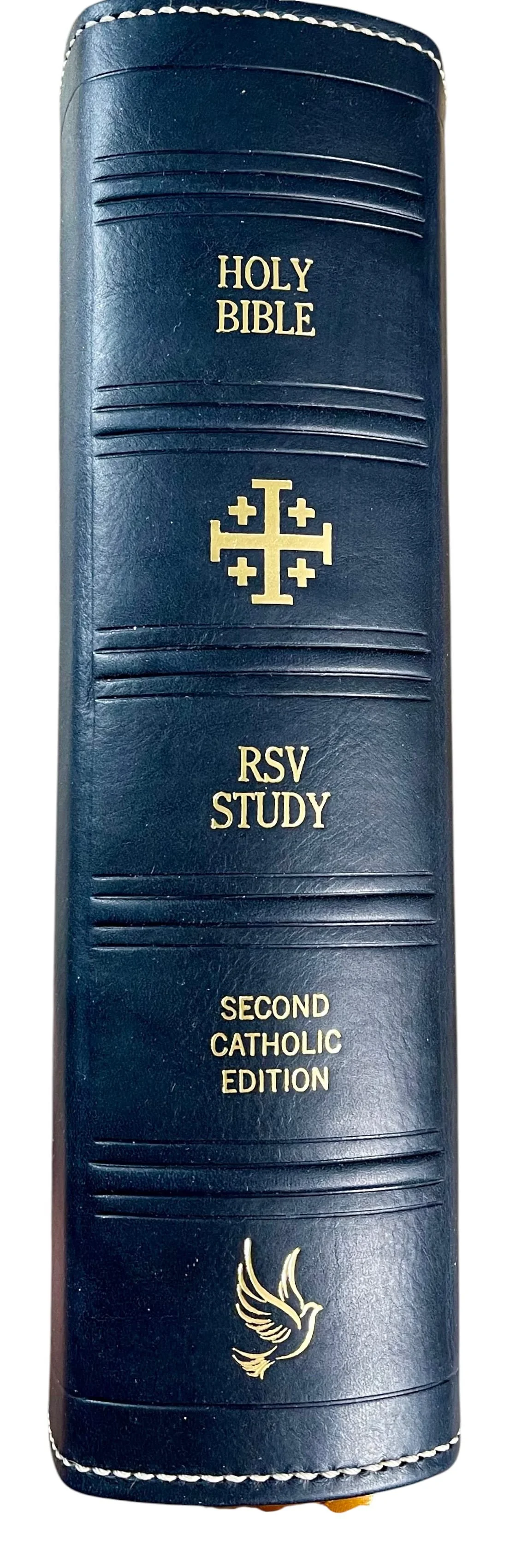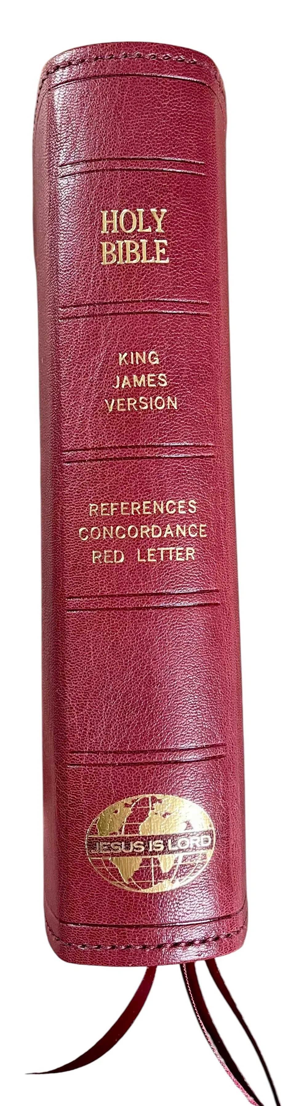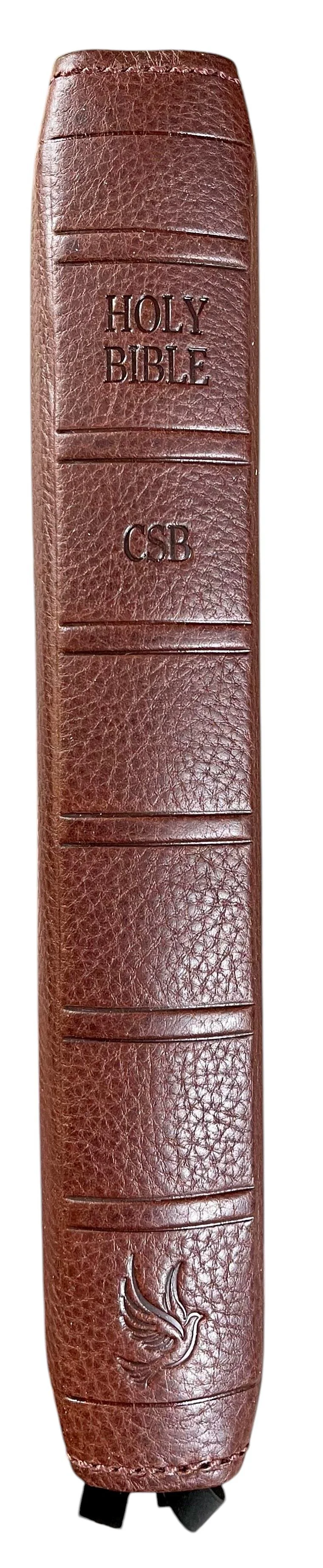 Our standard Bible rebinding spine stamping includes, "HOLY BIBLE," the translation acronym (KJV, NASB, etc.), and our Maker's Mark (Dove).