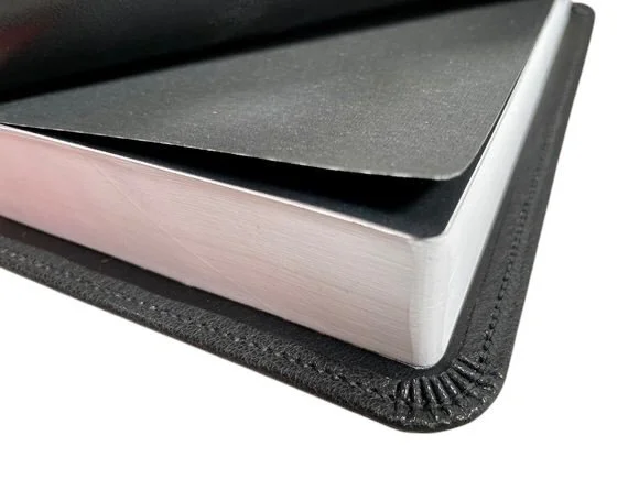 Many people have a favorite Bible they want to rebind, and sometimes it’s a hardback Bible. We can round the squared off page corners of a hardback during the Bible rebinding process. Rounding the page corners simply looks better in a soft leather bound cover.